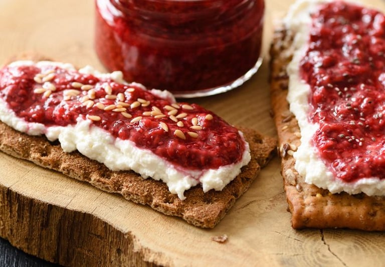 Knekkebrød med cottage cheese og syltetøy